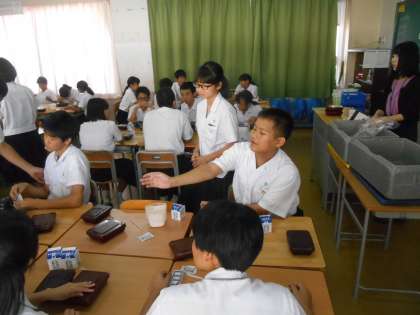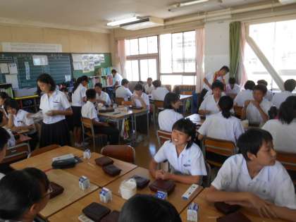 給食の配膳中です。ワイワイ言いながら待っているところでした。