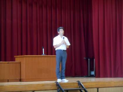朝礼でした。1.サポートルームでの嬉しかった話。2.体育大会には三つの自慢があると思う。一つ目は体力自慢、二つ目は一生懸命やったことが自慢になる。三つ目はあったかい仲間と競技、演技をすること。全員が楽しめる体育大会をめざしたい、と校長より話しました。