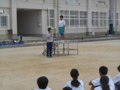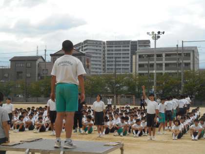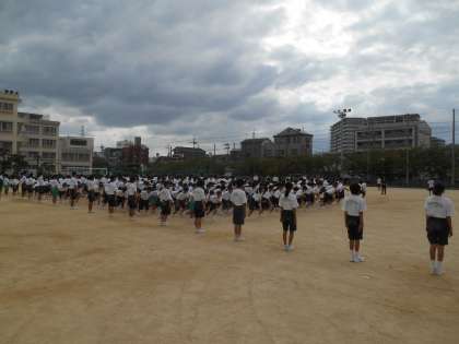 体育大会でのお辞儀の仕方、角度、手の位置などを教わっているところです。次は体操隊形に開くところを練習していました。いきなり、ほぼ完成しています。体育の授業などでおよそは分かっているのですが、全員でやるのは今日が初めてなのに、すばらしいです。