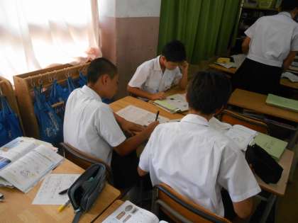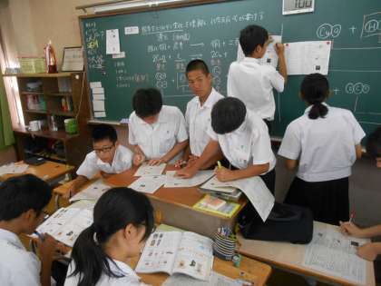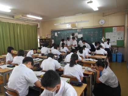 問題に真剣に向き合っている人、解答し終って、答え合わせに集中している人、友人に教えてもらっている人、とにかく活気のある教室でした。