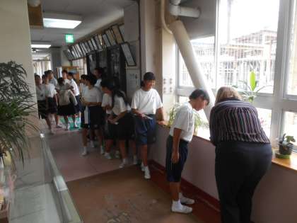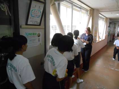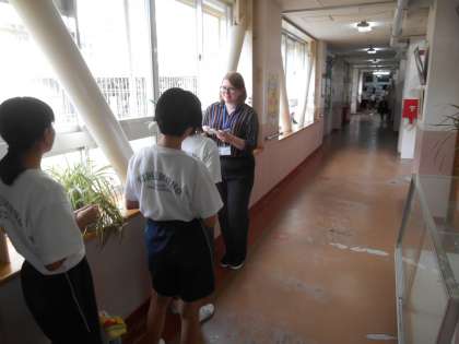 AETの先生に1年生が英語を聞いてもらっています。
