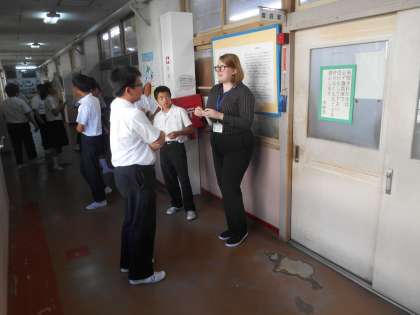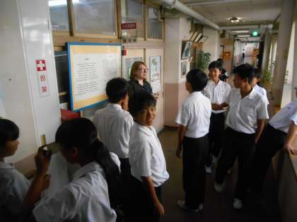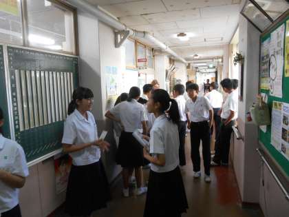 昼休みです。AETの先生に英語を聞いてもらっています。