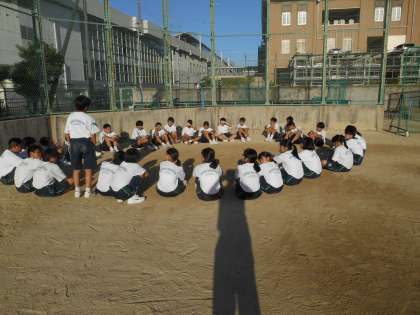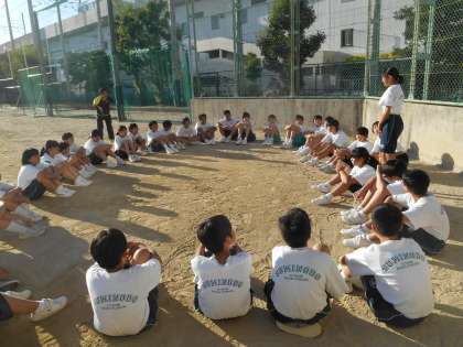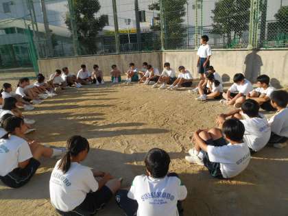 校長が校舎に入ろうとすると、ある先生が走ってきて、「校長先生。中に入っている場合と違いますよ。」と言って指さす方を見ると、グラウンドにはしで輪になってクラスミーティングをしているではありませんか。よっしゃ、と飛んでいきました。聞くと、大縄跳びがうまくいかず、さっそく話し合っている様子です。すばらしい。これぞ、住中魂。