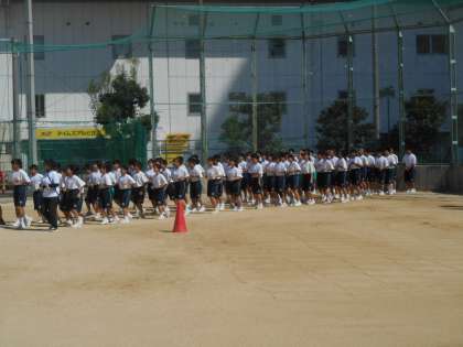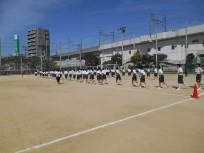 先生の説明を聞いて、「今から、2分以内で入場の形になりなさい。」の指示にダダダッと走って移動し、1分30秒できれいに整列が終わりました。すばらしい。移動のときも「走れ。」「走ろ。」と自然に生徒から声が出ます。泣きそうなほどうれしいです。