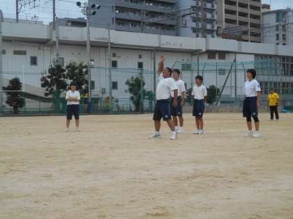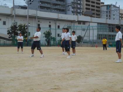 全体練習の始めに、生徒会役員の人たちがメッセージをみんなに伝えるために寸劇をしているところです。「ぼくはー、校歌を思いっきり歌いまーす。」「ぼくは行進を真剣に行いまーす。」とそれぞれ大声で叫んだあとに、「ぼくはしっかりご飯を食べますー。」と言って、一同ガクッとなる内容でした。もちろん、最後にはフォローが入って、すばらしいメッセージになりました。校長も登場しました。