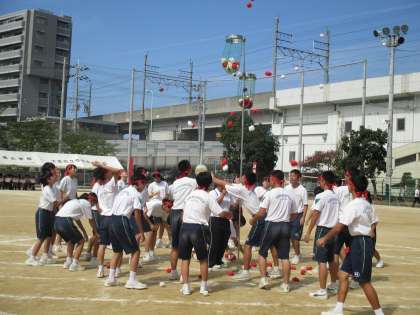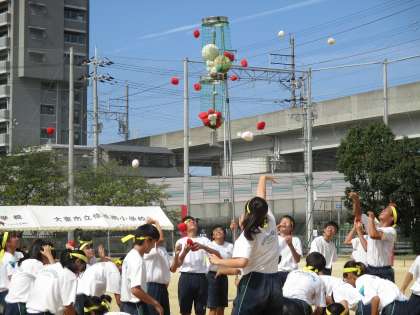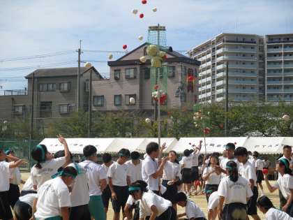 必死で玉を入れています。運動が苦手な子も得意な子も全員が楽しめるものを学年種目にしようと去年に続き、今年も行いました。
