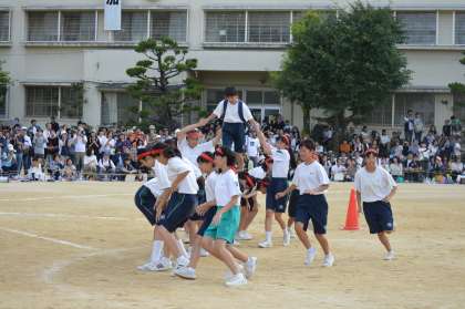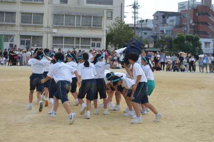 2年学年種目の「ミッション オブ ドーナツ 絆で渡りきれ」です。練習のときはクラスの差が大きく、どうなることかと思っていましたが、本番ではほとんど差がなくなりました。練習の成果です。すばらしい。