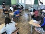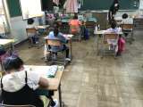 さて、今日の分散登校の様子です。教室内は、常に空気が循環するように換気に努めていますが、今朝のように少し肌寒い日は、上から羽織える服装がまだ必要かなと思いました。