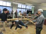 また警察官が到着するまでに教職員で犯人の動きを封じるために、「さすまた」(写真上)や「ネットランチャー」(写真下)の効果的な使い方を犯人役の警察官を相手に練習しました。
