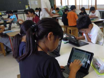 5年生の理科の学習です。台風によって引き起こされる災害について各自で調べたことを、発表ノートの画面上で共有し交流しています。