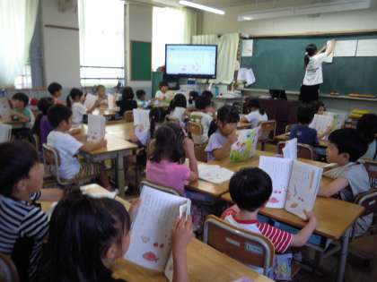 1年生の国語の学習です。ことばあそびうた「たべもの」の音読、息のそろった元気な声がひびいています。