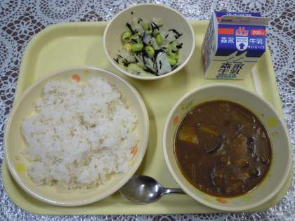 今日の給食メニューは、夏野菜の米粉チキンカレー・麦ごはん・ひじきサラダ・和風ドレッシング・牛乳です。夏野菜には、暑い夏にのぼせた体を調整するはたらきがあるということで、今日のカレーには、カボチャとナスが入っています。暑い夏をのり切るためには、睡眠・休養とともに、しっかりと栄養をとることが大切です。