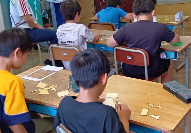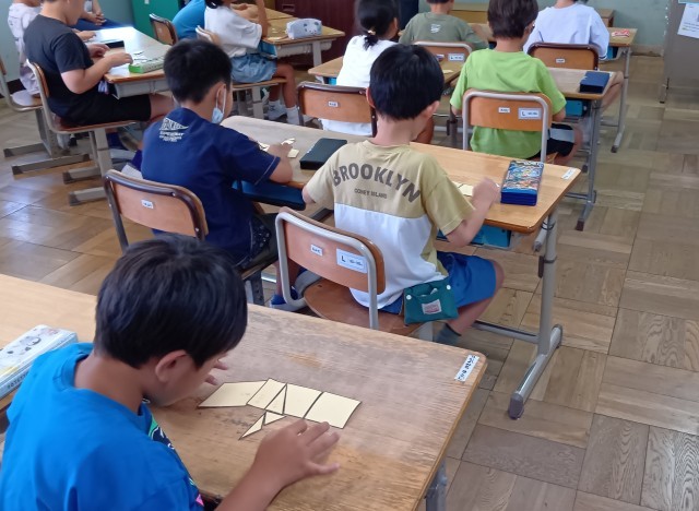 2年生の算数、「長方形と正方形」の単元、三角形や四角形のパズルをつかっていろいろな形をつくっています。