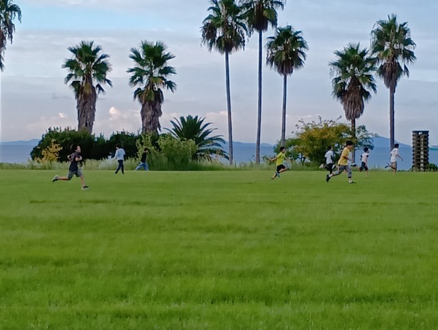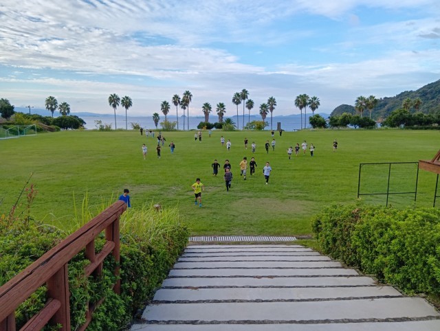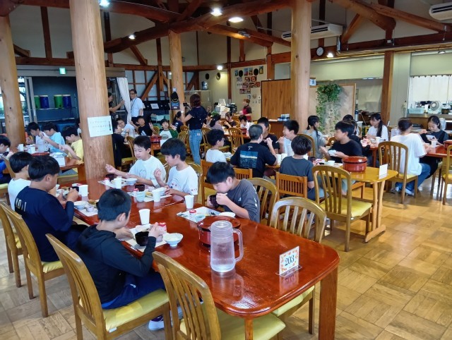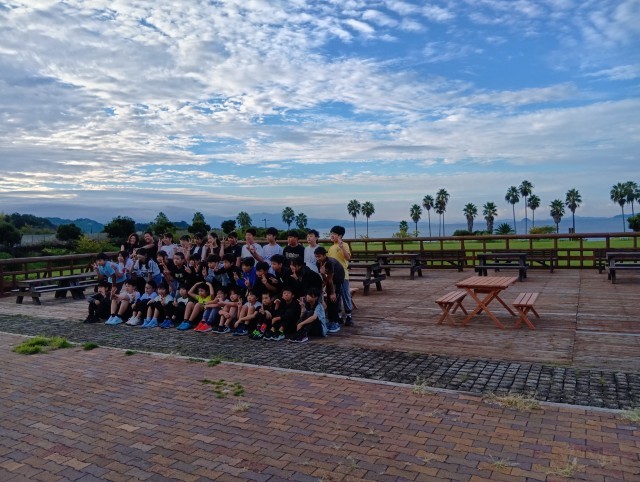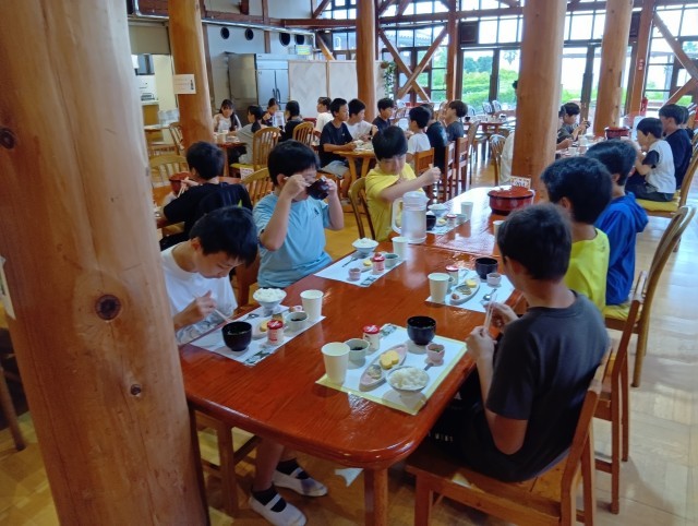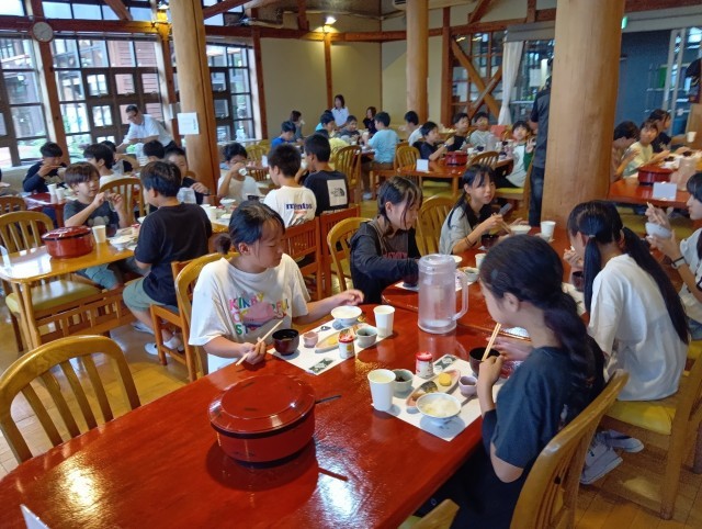 修学旅行2日目、さわやかな天候の朝です。宿舎前で集合写真、芝生の上で少し体を動かしたあと朝食です。しっかりと食べて1日のスタートです。