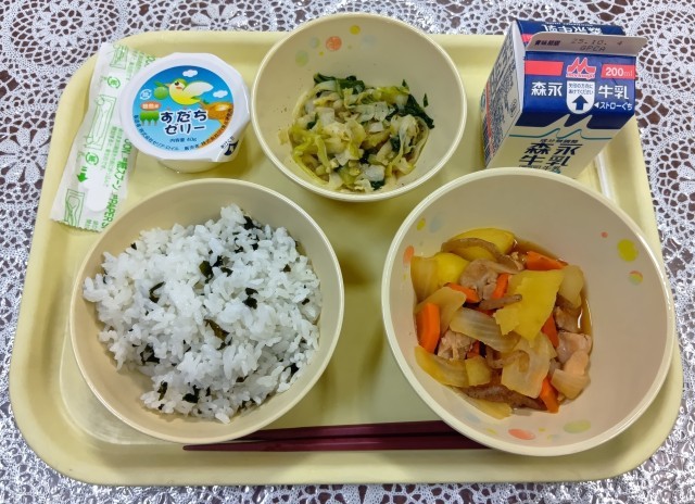 今日の給食メニューは、鶏じゃが・わかめごはん・おひたし・すだちゼリー・牛乳です。「鶏じゃが」は、鶏肉を使った肉じゃがで、鶏肉の他に、じゃがいも・こんにゃく・玉ねぎ・にんじんが入っています。