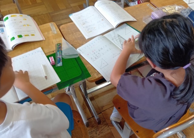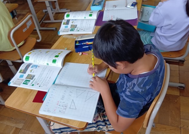 2年生の算数の学習です。「正方形と長方形」の単元、三角定規をつかって図形を描いています。