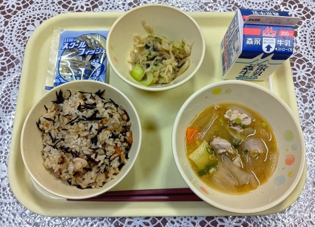 今日の給食メニューは、ひじき大豆ごはん・豚汁・切干し大根のごまあえ・ミニフィッシュ・牛乳です。ひじきは海藻の一種で、鉄分とカルシウムが多く含まれていて体をつくるために必要な栄養素が多く、体に良いことがたくさんある食品です。