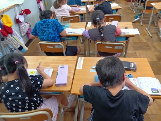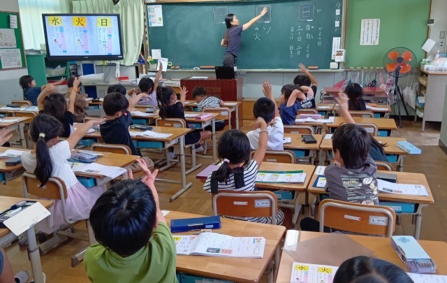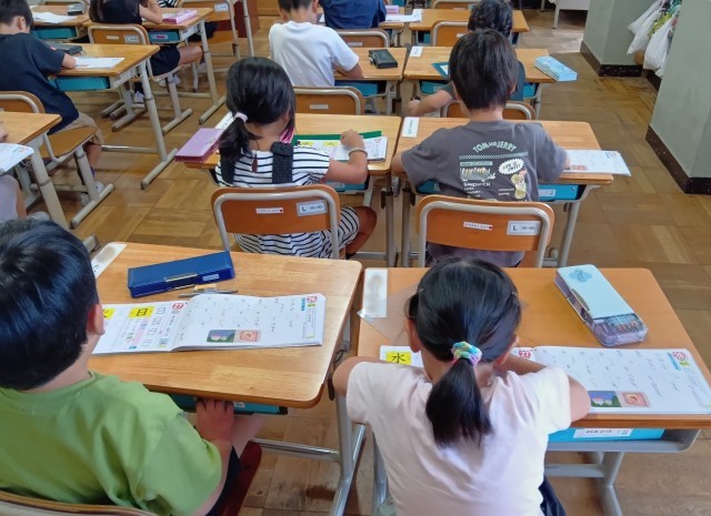 1年生の国語の学習です。「日」「火」「水」の漢字について学習しています。