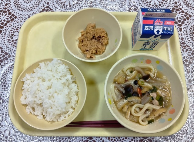 今日の給食メニューは、きざみうどん・シーチキンのそぼろ煮・ごはん・牛乳です。シーチキンのそぼろ煮をごはんにかけると、とてもよく合いました。