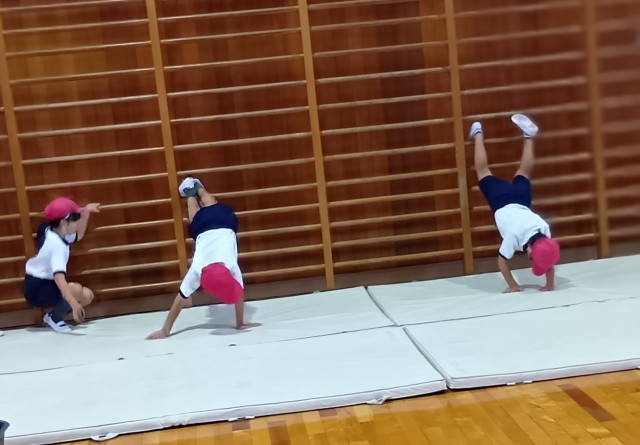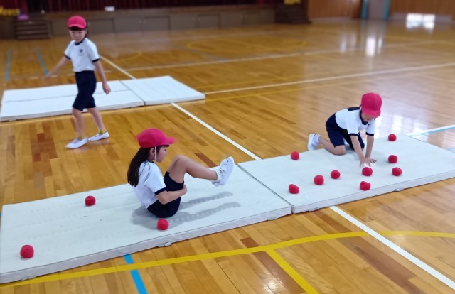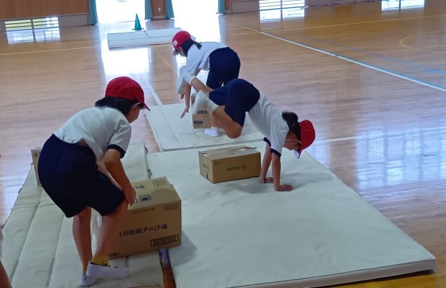 2年生の体育、『にんじゃマット』と名づけられたいろいろなコースで、楽しみながら工夫した動きに取り組んでいます。