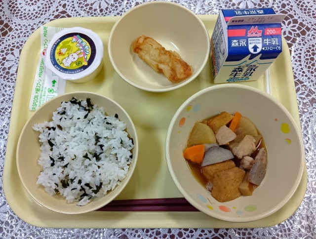 今日の給食メニューは、青菜わかめごはん・鶏肉と里芋の煮物・ちくわの天ぷら・月見ゼリー・牛乳です。今日は中秋の名月(十五夜)ということで、ススキとお団子で月見をして秋を感じるという日なのですが、今夜の天気はきれいな月が見られるでしょうか。
