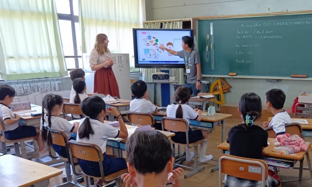 3年生の外国語の学習です。「My name is~」「Do you like ?」、AETAssistant English Teacher)の先生の発音をしっかりと聞き取りながら学んでいます。