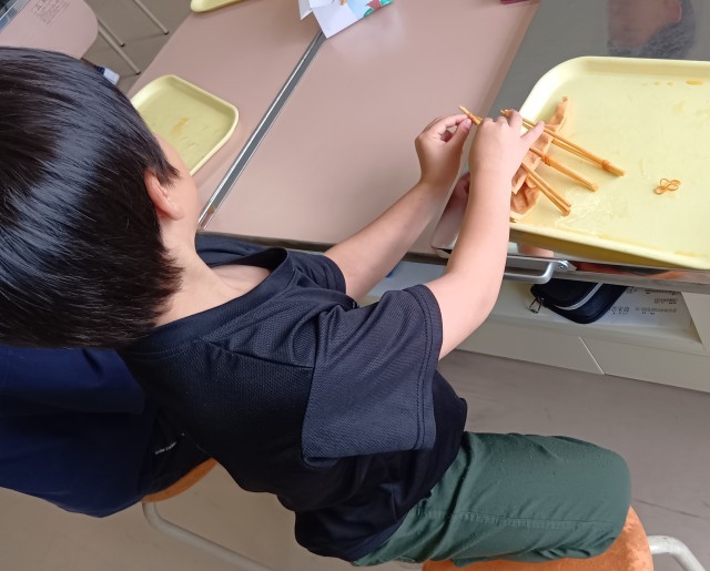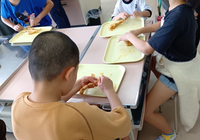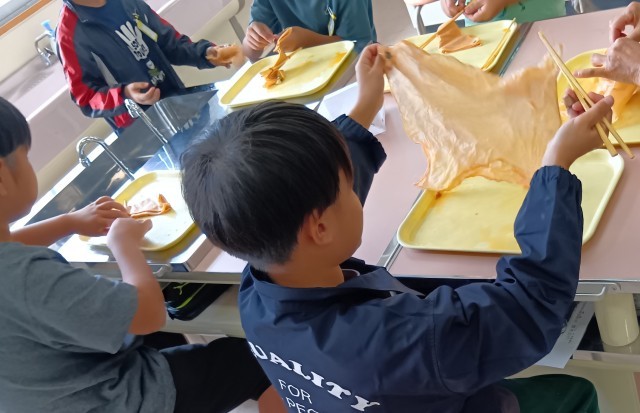 あおぞら学級の学習で、玉ねぎの皮をつかった草木染めにチャレンジしています。自然の色合いで鮮やかな模様に染め上がっています。