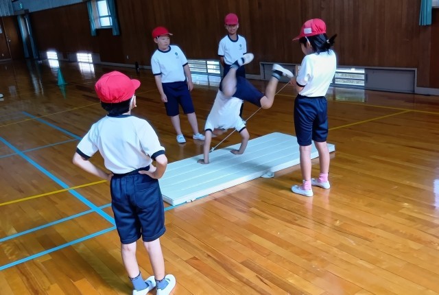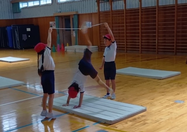 3年生の体育、マット運動の学習。側転の練習で、ゴムひもを使って足を高く上げることを意識しています。