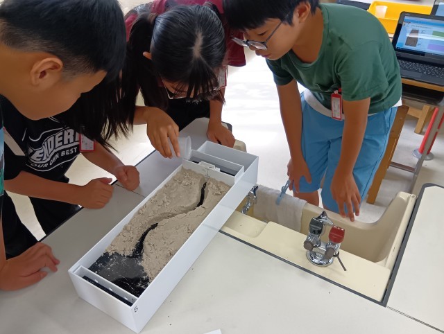 5年生の理科の学習、流れる水のようすについて、曲がりくねった川に見立てた土に実際に水を流して実験しながら観察して学んでいます。
