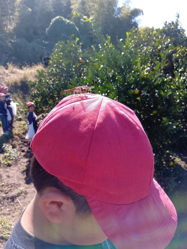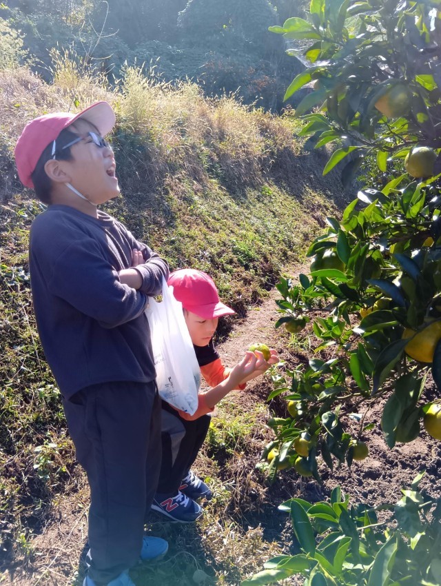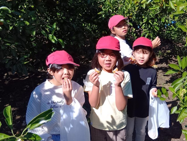 3年生が交野市にあるみかん農園に校外学習に出かけています。さわやかな天候のもと、もぎたてのみかんを、おいしくいただいています。
