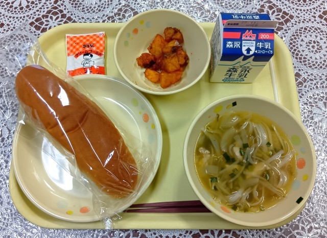 今日の給食メニューは、鶏肉のフォー・ホキのケチャップあえ・コッペパン・ミルクバター・牛乳です。「フォー」は、ベトナム料理には欠かせない麺で、米から作られた平たい麺です。今日の給食の「鶏肉のフォー」は、スープに鶏肉と玉ねぎ、もやし、ニラなどの野菜と一緒にフォーを入れ、オイスターソースやレモン汁、チリパウダーで味にアクセントをつけています。