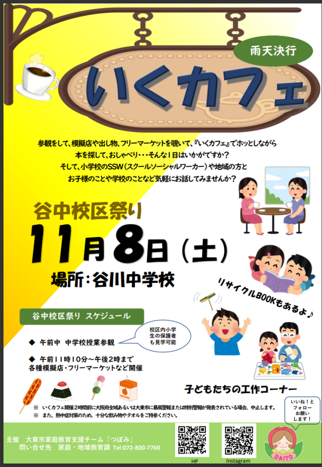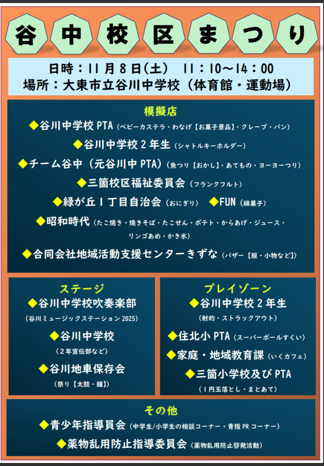 11月8日(土)に谷川中学校区まつりが開催されます。いろいろな模擬店やステージ、プレイゾーンなどがあります。ぜひお誘い合わせのうえご参加ください。