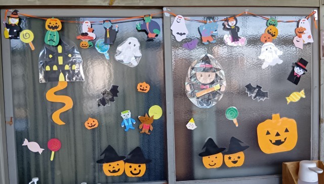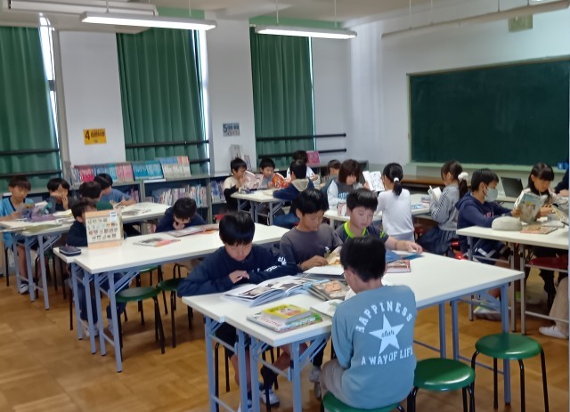読書の秋、4年生が図書の時間に読書に集中しています。図書室前の飾りつけはハロウィン仕様です。