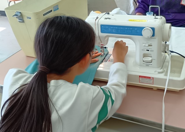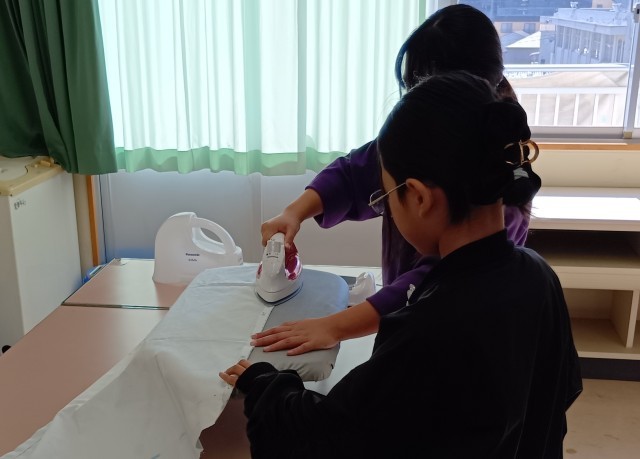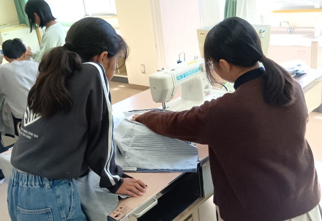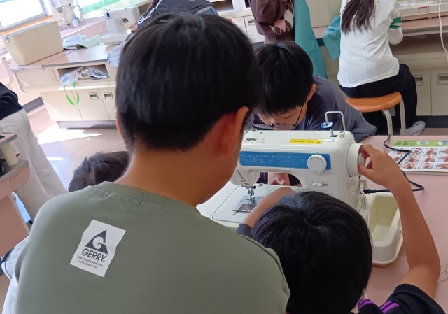 5年生が家庭科の学習で「エプロンづくり」に取り組んでいます。ミシン縫いやアイロンがけに慣れない手つきながらも互いに協力して一生懸命がんばっています。