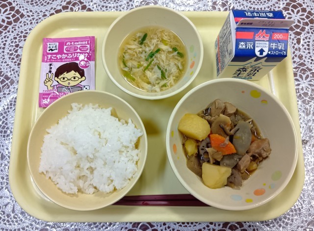 今日の給食メニューは、筑前煮・かきたま汁・ごはん・ふりかけ・牛乳です。「筑前煮」は、福岡県で「かめ煮」と呼ばれる郷土料理で、福岡県の北部を昔は「筑前の国」と言っていたことから、「筑前煮」と呼ばれるようになったそうです。