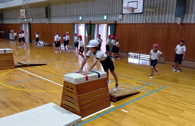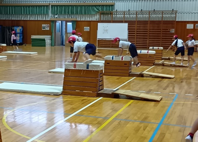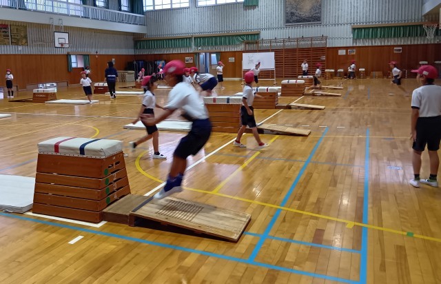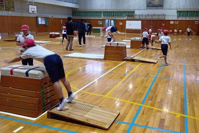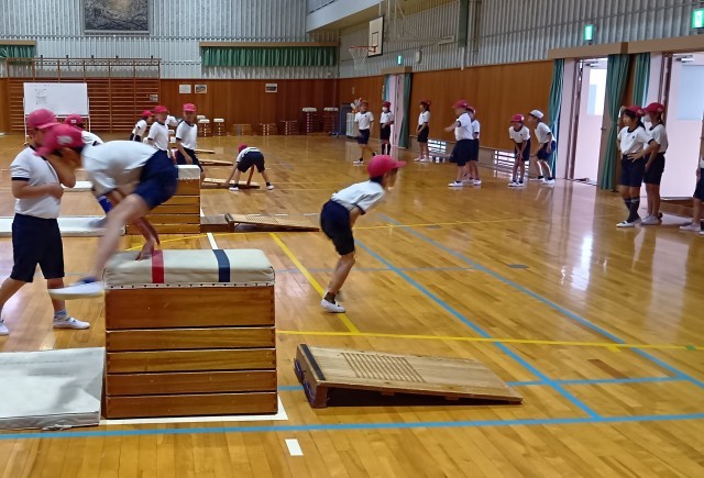 3年生が2クラス合同で体育の跳び箱運動に取り組んでいます。助走からの強い踏切り、手をつく位置などを意識しながら練習しています。