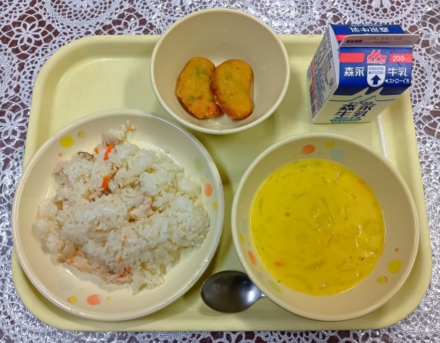 今日の給食メニューは、チキンピラフ・かぼちゃのポタージュ・豆腐ナゲット・牛乳です。かぼちゃは、肌や目を丈夫にし、からだの免疫力を高めるなど、栄養価の高さは野菜の中でもトップクラスです。