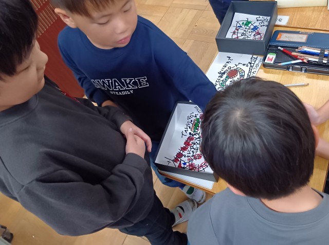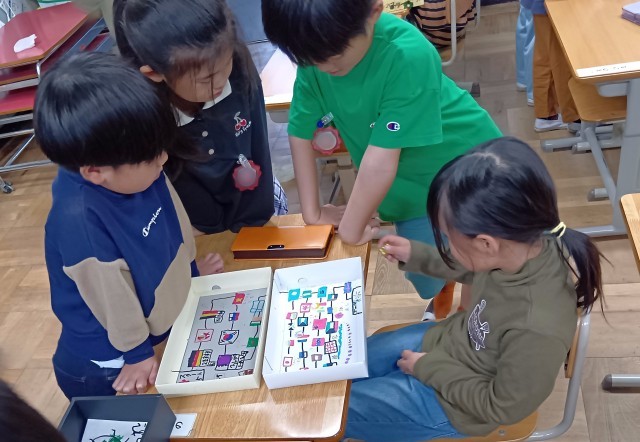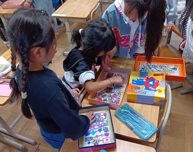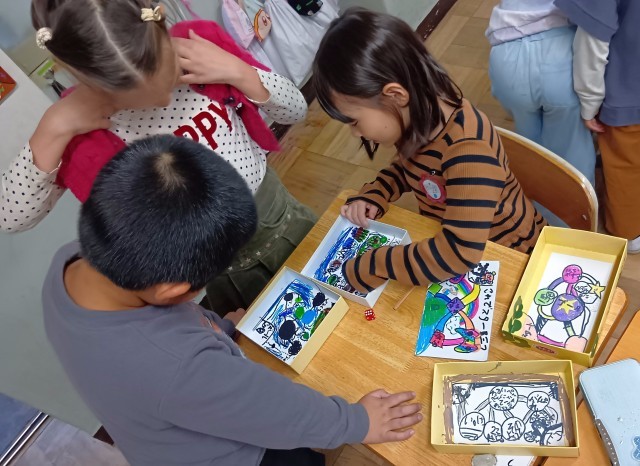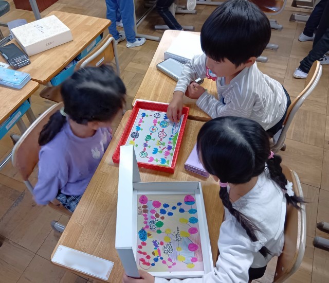 1年生が手づくりのすごろくあそびに取り組んでいます。空き箱で作ったオリジナルのすごろくで、仲よく楽しくあそびました。