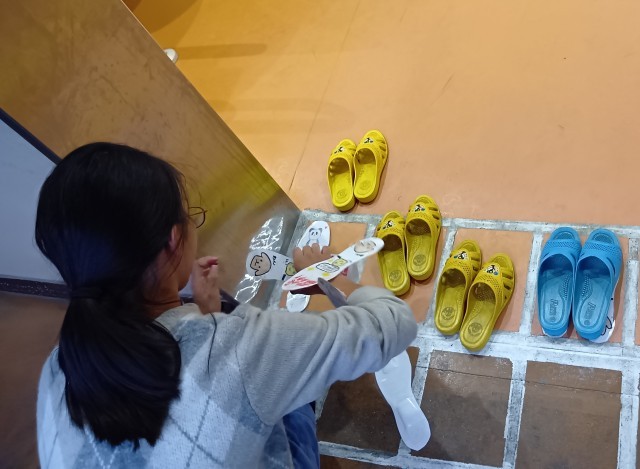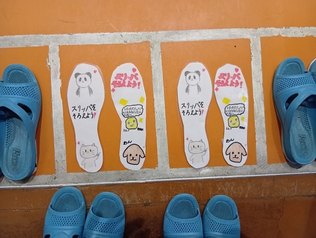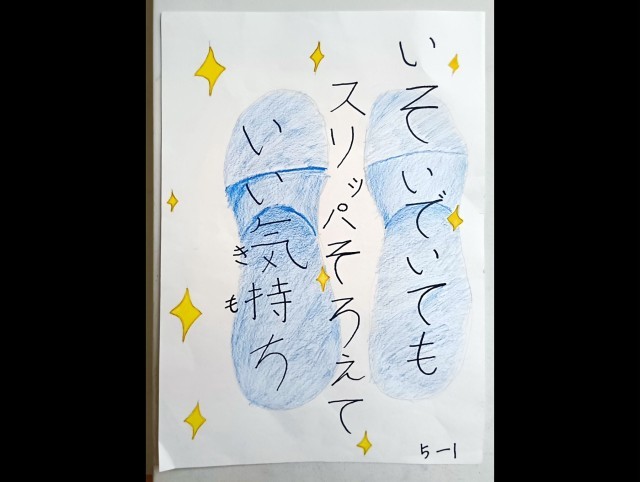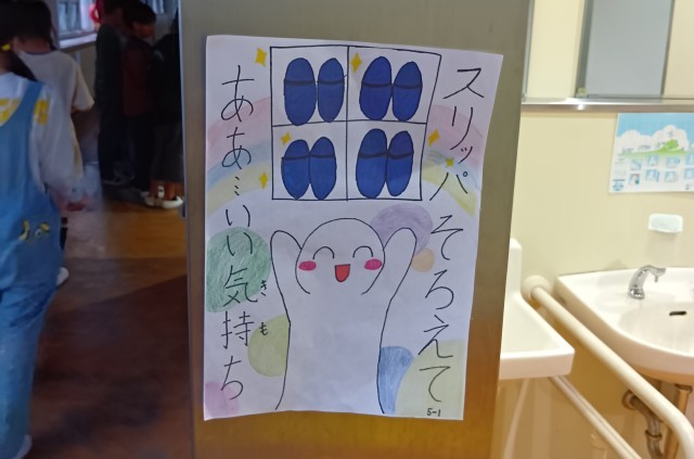 5年生がトイレのスリッパをみんながよりきれいに揃えられるようにと考えて、手づくりのポスターや足型シールを貼る取組みをしています。