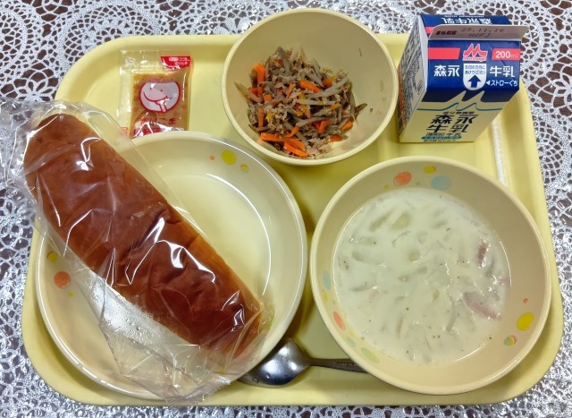 今日の給食メニューは、ハニーパン・おいものポタージュ・ごぼうサラダ・ごまドレッシング・牛乳です。「おいものポタージュ」は、さつまいもを使ったとろみのついたスープです。さつまいもには、記憶力をよくし、便秘を防ぐなど、いろいろな病気にかかりにくくする働きがあります。