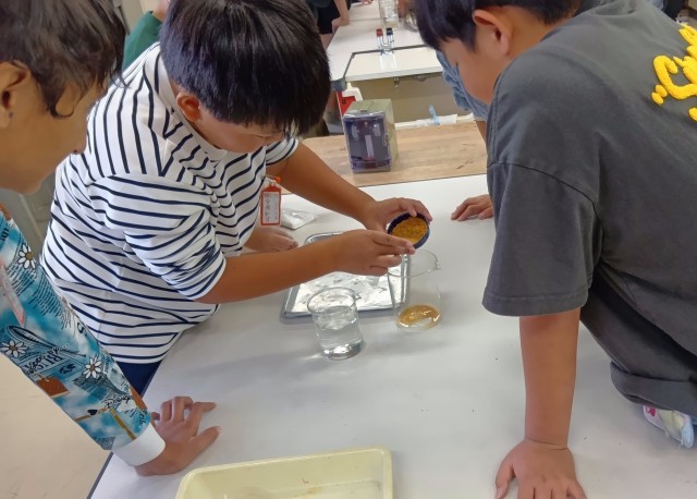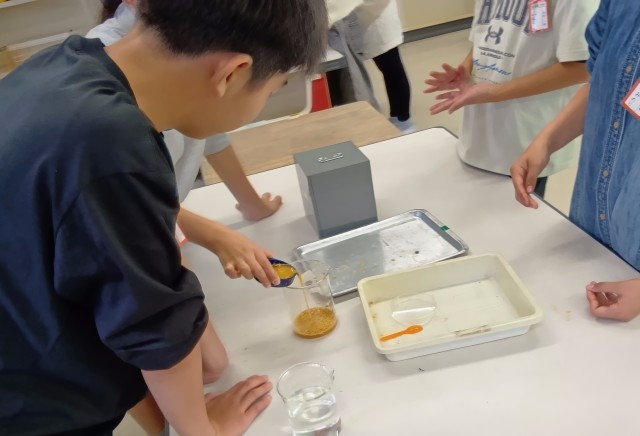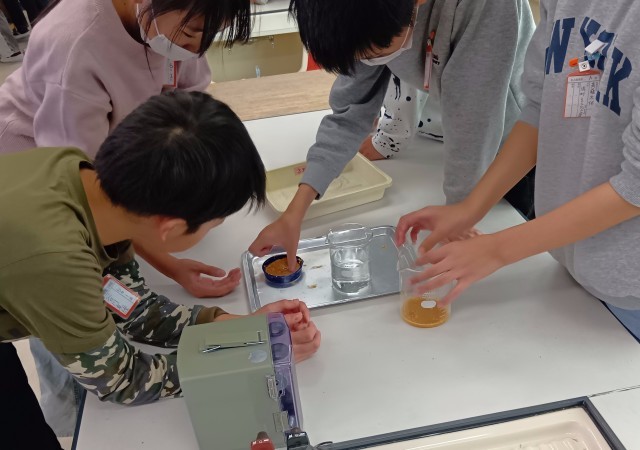 6年生の理科の学習、鹿沼土という土を使って火山灰の粒のようすについて観察をしています。