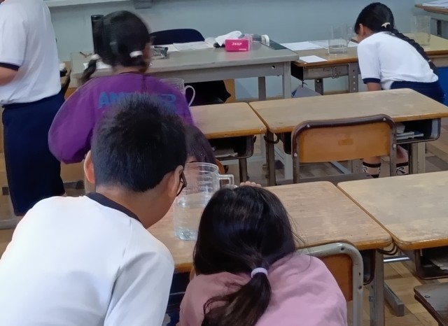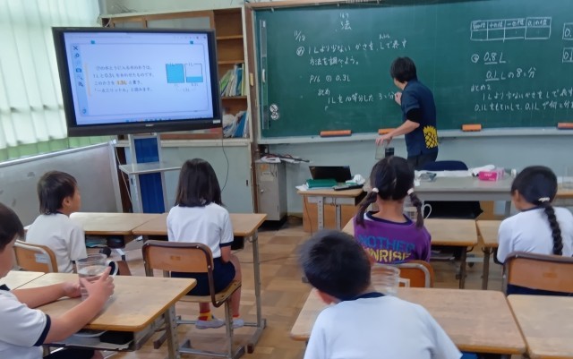 3年生の算数の学習、1リットルよりも少ない水のかさの表し方について、実際に1リットルますに入った水の量を確かめながら学習しています。