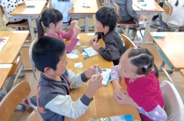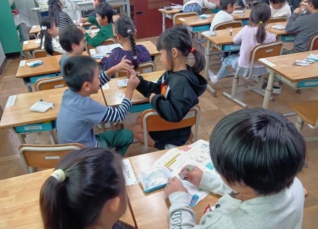 1年生が計算カードを使って、おたがいに問題を出し合っています。けいさんのスピードがどんどん速くなってきました。
