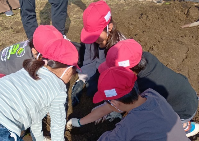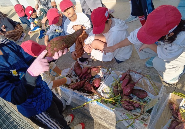 2年生が校庭の畑でいもほりをしました。大きなさつまいもが掘れました。