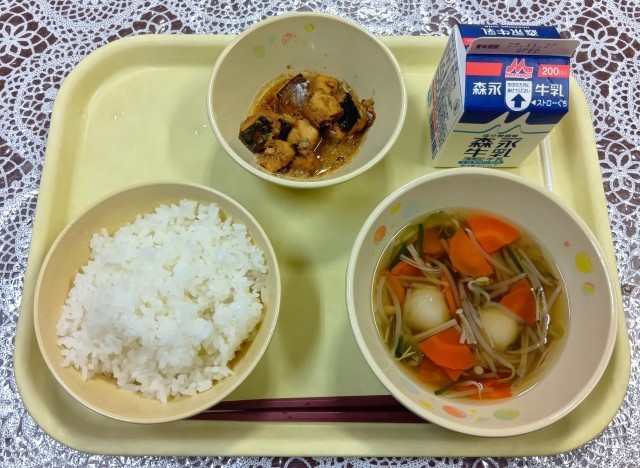 今日の給食メニューは、ごはん・五目汁・鯖のソース煮・牛乳です。「鯖(さば)」は、青魚の中でも「青魚の王様」といわれるくらい栄養価が高い魚です。からだを作るたんぱく質が多く、頭のはたらきをよくし、血をサラサラにする栄養があります。