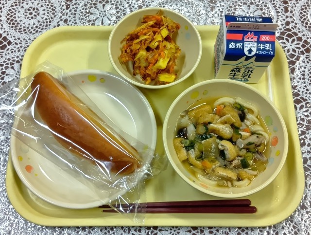 今日の給食メニューは、肉きざみうどん・野菜かきあげ・黒糖ベビーパン・牛乳です。野菜かきあげはサクサクの衣で、さつまいもの甘みが感じられました。