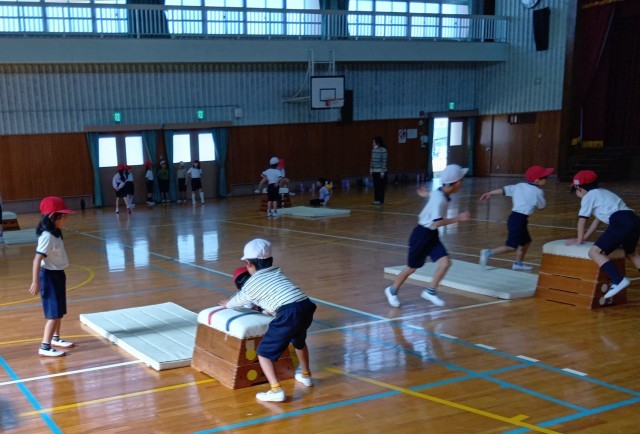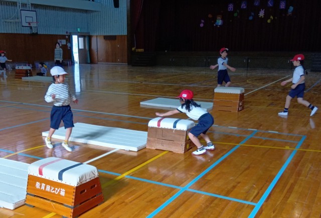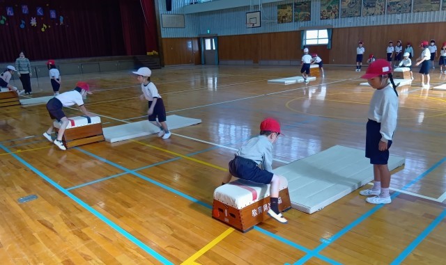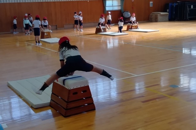 1年生の体育、両足をそろえてふみきり、両手をしっかりととびばこについてから、まずは跳び箱にのる基本の動きからはじめます。
