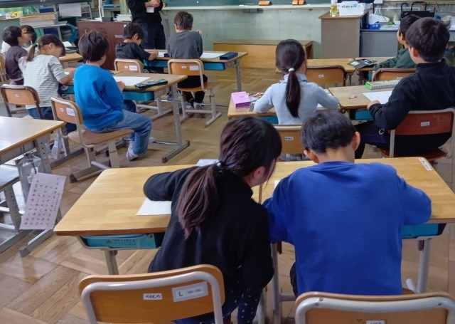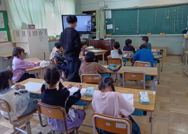 2年生の国語の学習、家の中にある物や食べ物の中でカタカナで表すものを、となりの子と相談しながら考えています。
