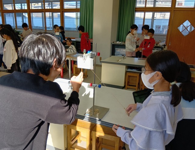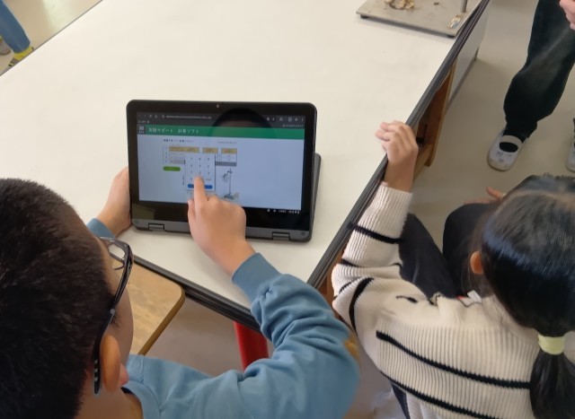 5年生の理科、ふりこの振れ幅を変えながら1往復する時間を調べる実験、「実験サポート計算ソフト」に結果を入力して確かめています。