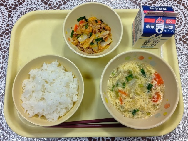 今日の給食メニューは、ごはん・たまごトック・豚キムチ・牛乳です。トックは韓国・朝鮮のおもちのことで、細長い棒のようにしたもちを斜めに薄い輪切りにしています。細長くするのは「長生きするように」と願ってのことだそうです。